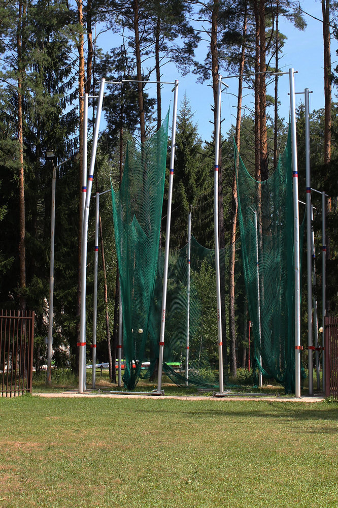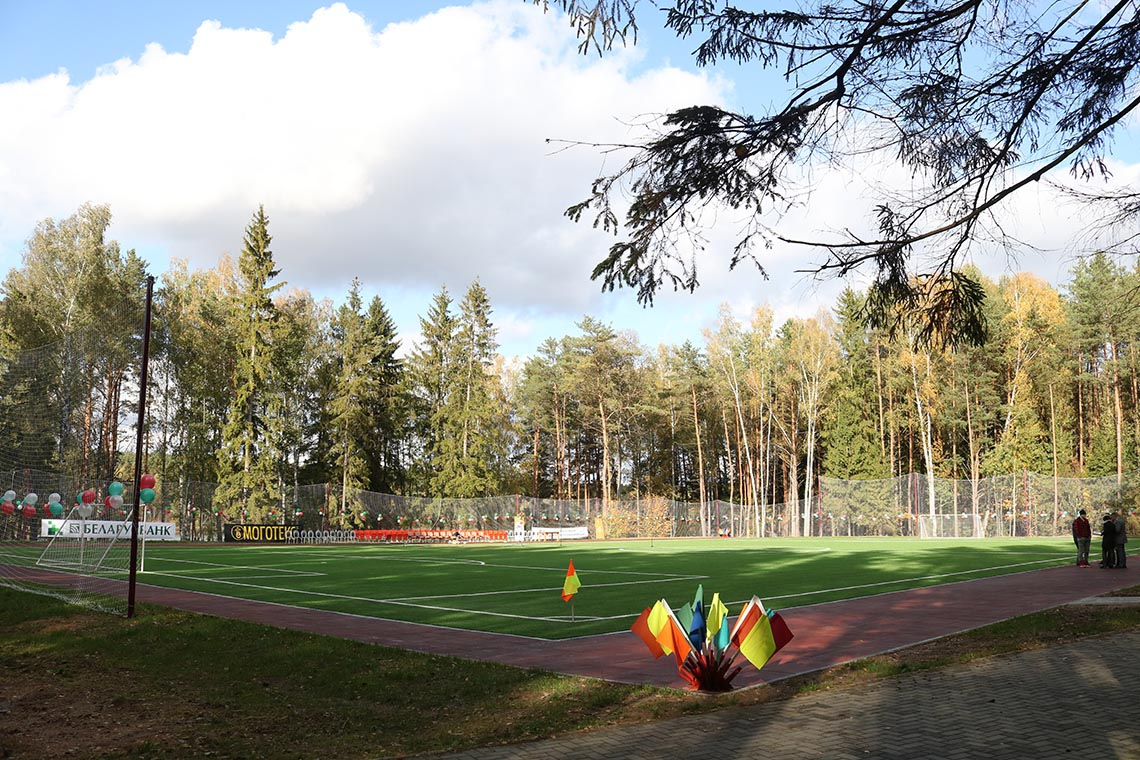 Размер поля 73,30х43,30 м. Покрытие искусственное синтетическое. Размер ворот: 5,0 м (длина) х 2,0 м (высота) х 1,55 м (глубина). По длинным сторонам установлены 2 пары гандбольных ворот. По периметру поля дорожка для бега с резиновым покрытием. Общая длина дорожки 238 м.